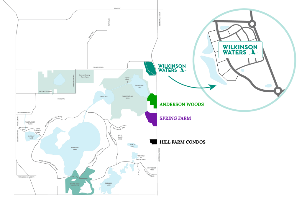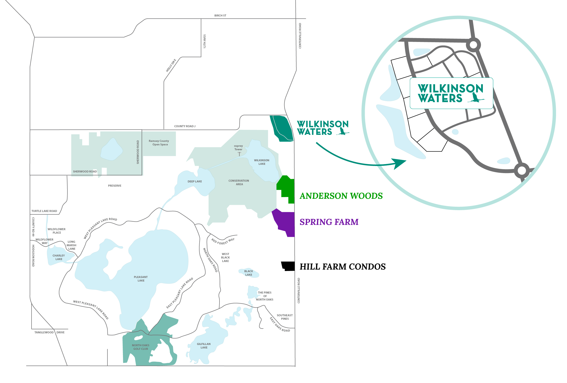 Whether you are looking for maintenance-free living in the Spring Farm townhomes or the Hill Farm Condos, the family neighborhood of East Preserve, or the large, wooded lots in Red Forest Way, North Oaks is the premier community in which to build your home.